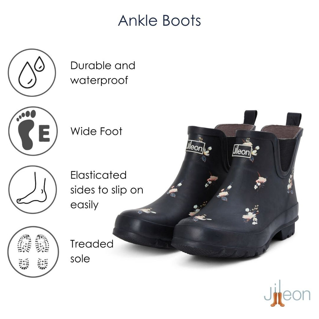 Ankle Height Rain Boots - Black Floral - Wide Foot - Easy to Slip On